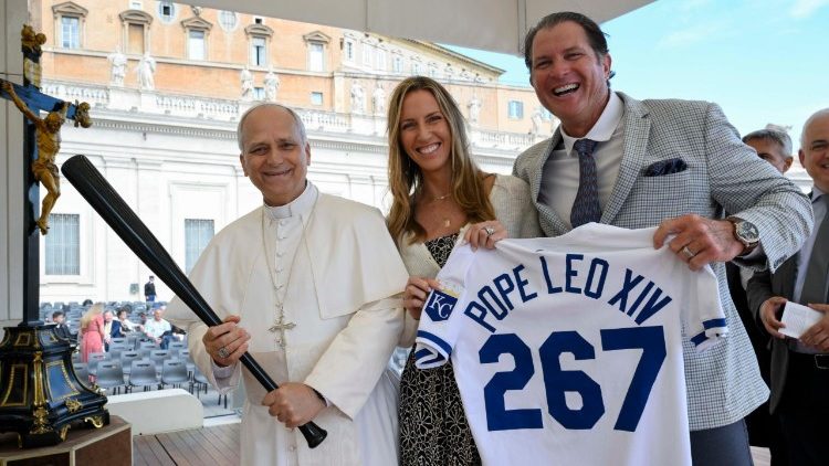Siguiendo en clave deportiva, el exjugador estadounidense de béisbol Mike Sweeney, hoy muy comprometido en obras sociales, entregó al Papa una maza de juego con la inscripción “Leone XIV”, junto con una camiseta estampada con “Pope Leo XIV” y el número 267, en referencia al sucesor de Pedro.