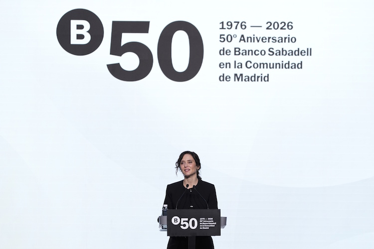 Madrid, 17 de marzo 2026.- En el acto conmemorativo del 50º aniversario de la llegada del Sabadell a la Comunidad de Madrid, celebrado en la Real Casa de Correos, la presidenta ha recordado la historia de esta entidad financiera que ha crecido acompañando a miles de emprendedores, autónomos y empresas madrileñas. Por este motivo, ha recordado Díaz Ayuso, en 2012 fue reconocida con la placa de honor en la categoría de Encomienda de Número de la Orden del Dos de Mayo.