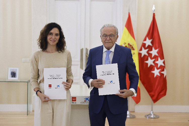 La presidenta de la Comunidad de Madrid ha rubricado hoy este acuerdo con su homólogo de la entidad catalana, Isidro Fainé.