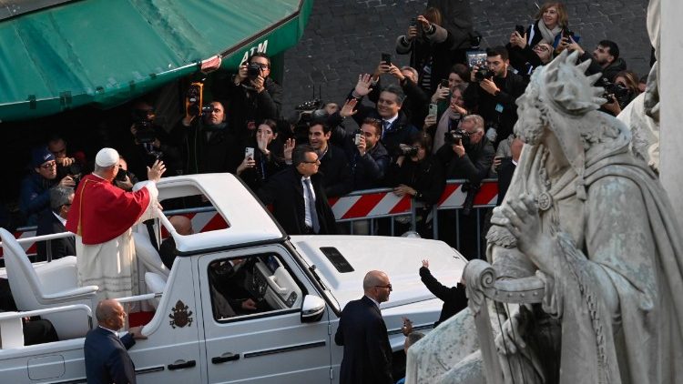 Cuando el Santo Padre llegó a la Piazza di Spagna, el coro y la asamblea entonaron un himno mariano titulado «Te levantas más hermosa que el alba». El Vicario de Roma, el cardenal Baldassare Reina, y el alcalde de Roma, Roberto Gualtieri, dieron la bienvenida al Papa a su llegada.
