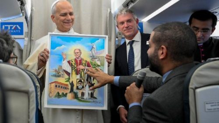 2 de diciembre 2025.- «En primer lugar, quiero dar las gracias a todos los que han trabajado tanto. Me gustaría que transmitieran este mensaje también a los demás periodistas, tanto en Turquía como en el Líbano, que han trabajado para comunicar los importantes mensajes de este viaje. Todos ustedes también merecen un fuerte aplauso por este viaje». Así saludó el Papa León XIV a los 81 periodistas presentes en el vuelo de regreso de Beirut a Roma y respondió a las preguntas de algunos de ellos, hablando en inglés, italiano y español. El viaje, Oriente Medio, la guerra en Ucrania, la presencia de Europa en las negociaciones de paz, la situación de Venezuela… Estos fueron algunos de los temas abordados por el Pontífice, que recibió como regalo de un corresponsal libanés un cuadro pintado a mano en directo por televisión, en estos mismos días, que lo retrata a él y a los lugares simbólicos visitados en el país de los cedros.