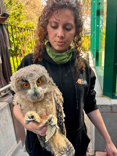 Pollo de búho real herido rescatado en Majadahonda (Madrid). (Foto: GREFA)