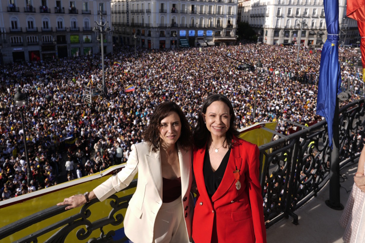 La presidenta de la Comunidad de Madrid, Isabel Díaz Ayuso, ha acompañado a la líder de la oposición venezolana María Corina Machado en su salida al balcón de la Real Casa de Correos, donde ambas se han dirigido a los miles de ciudadanos que se han dado cita en la Puerta del Sol hoy, tras el acto de imposición de la Medalla de Oro de la Administración regional a la Premio Nobel de la Paz.