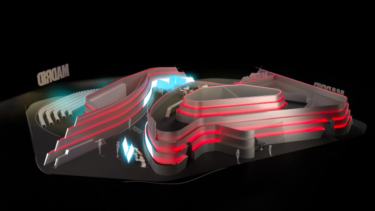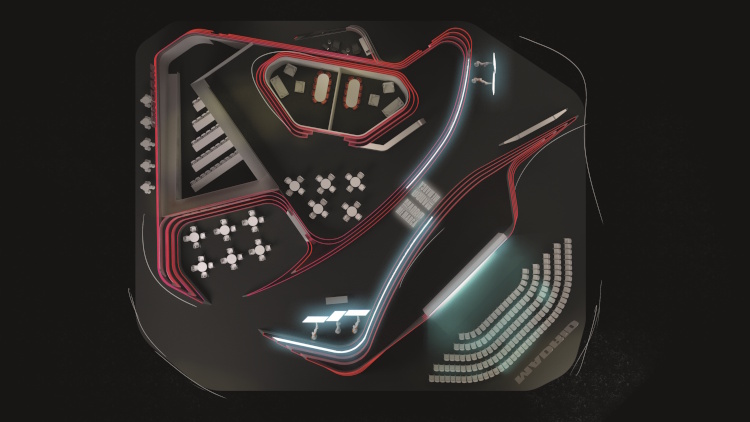 La planta evoca el trazado del circuito MADRING y las curvas que rodean el espacio simulan los carriles por los que circularán los monoplazas.