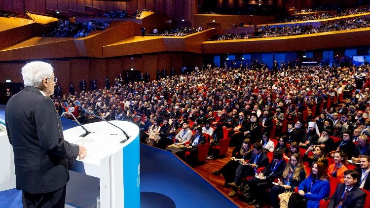 En su intervención, durante la asamblea inaugural, en la Sala Santa Cecilia del Auditorio Parco della Musica, el jefe de Estado trazó dramáticamente el escenario de un mundo que, con el fin de la Guerra Fría, pensaba haber abierto «una era de pacificación», pero que hoy se enfrenta, también en Europa, a una realidad completamente diferente. Así, «el tema de la fuerza pretende de nuevo ser la medida de las relaciones internacionales», y «el nacionalismo que se opone a otros nacionalismos nace, en el fondo, de considerar a los demás pueblos como enemigos, si no como presencias abusivas o incluso inferiores, para afirmar con prepotencia y, a menudo, con violencia, pretensiones de dominio».