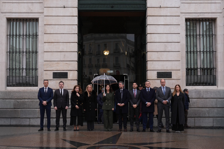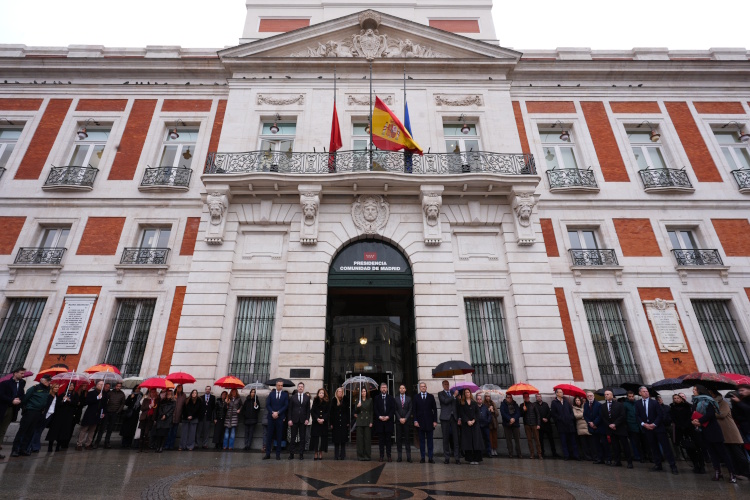 El acto ha tenido lugar en la Puerta del Sol, junto a la fachada de la Real Casa de Correos, sede el Gobierno regional, en el segundo de los tres días de luto como señal de duelo decretados por la presidenta Díaz Ayuso.